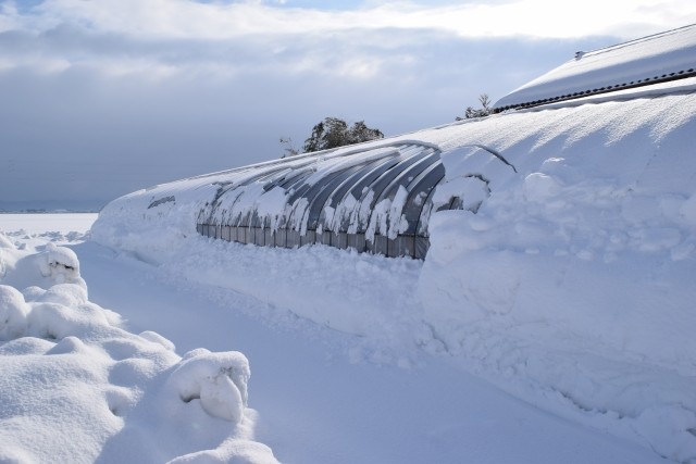 ビニールハウスは、側面に雪が吹き溜まったり、連棟ハウスの谷部分に雪が集中したりすると、不均等な荷重が骨組みにかかることで全体が歪んで倒壊することもあります。