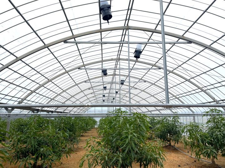 倉田さん 温度計で2℃下がりました。体感ではもっと涼しいですね。ハウスに入った瞬間のサウナみたいな熱気がなくなりました!あとはマンゴーの実の日焼けがなくなることを期待しています。今年は台風が来なかったため、台風の効果については来年分かると思います。